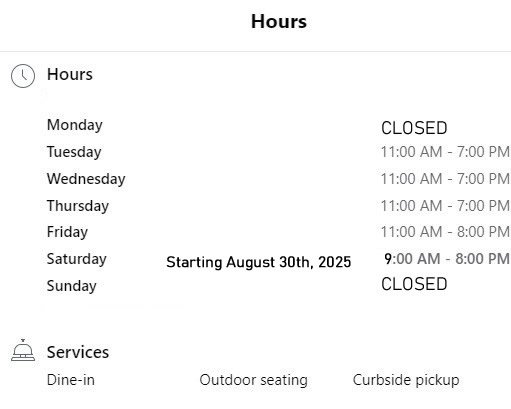 Please call for hours of operation or check on Google.